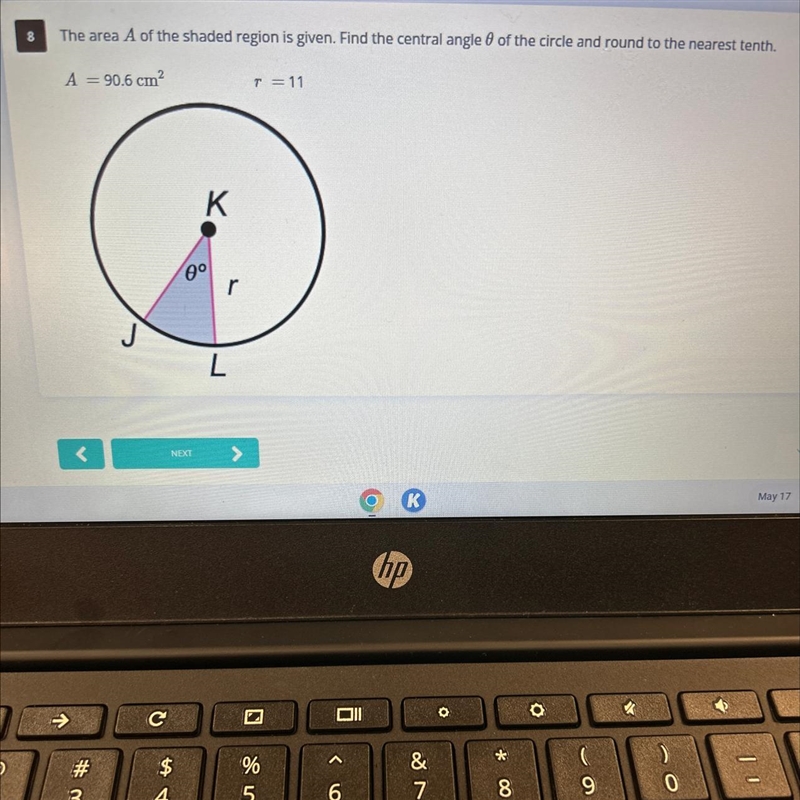 The area A of the shades region is given, find the central angle 0 of the circle and round to the nearest tenth