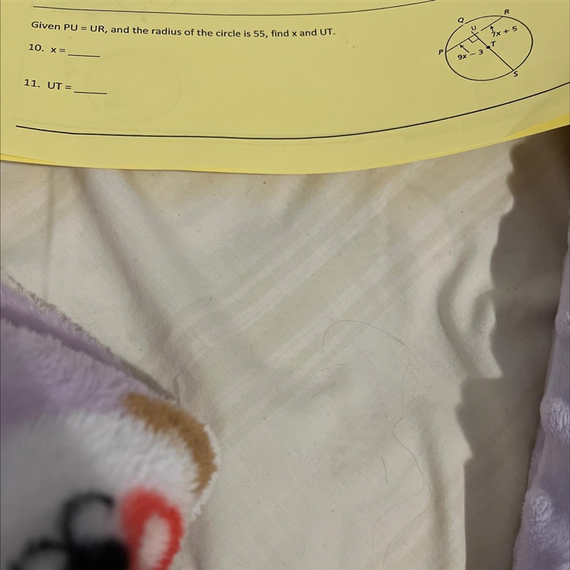 You want the value of x and the length of segment UT that bisects chord PR at point U into halves marked UP = (9x -3) and UR = (7x +5). The radius of circle T is 55 units.