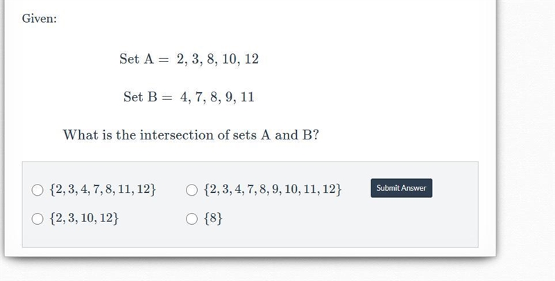 The intersection of sets A and B, denoted as A ∩ B, is the set of elements that appear in both sets. In this case, the intersection is: