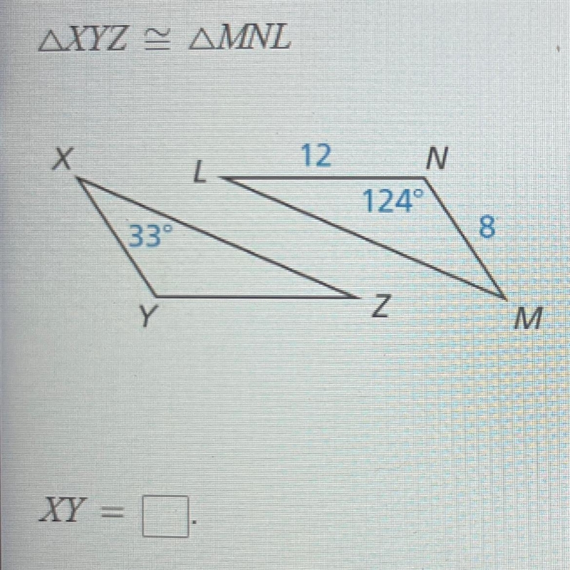 You want to know the measure of segment XY if ∆XYZ ≅ ∆MNL and MN = 8.