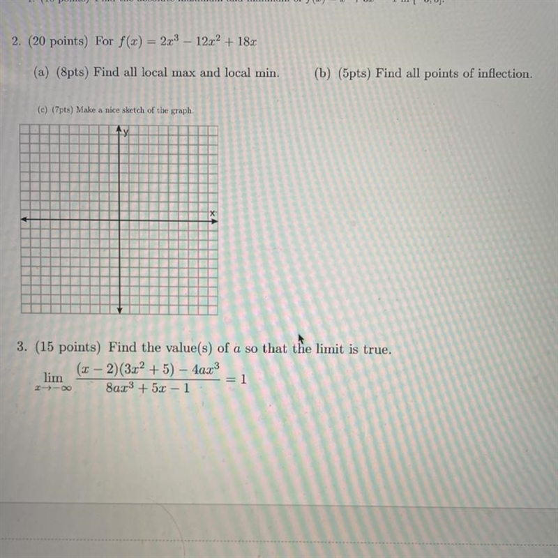 You want the extrema and the point of inflection of f(x) = 2x³ -12x² +18x, and you want the value of 'a' that makes the end behavior a horizontal asymptote at y = 1.