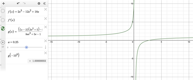 You want the limit as x → -∞ of ((x -2)(3x² +5) -4ax³)/(8ax³ +5x -1) to be 1.