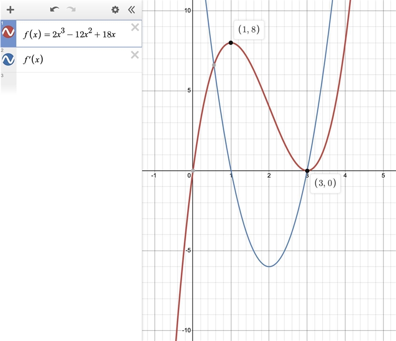 The cubic function f(x) = 2x³ -12x² +18x has derivative ...