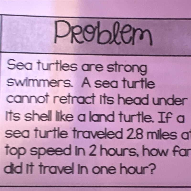 Sea turtles are strong swimming. A sea turtle cannot retract its head under its shell like a land turtle. If a sea turtles traveled 2.8miles at top speed in 2 hours, how far did it travel in one hour?