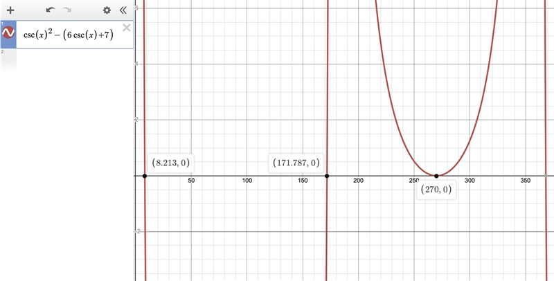 The second attachment shows a graphing calculator solution for csc(θ)² -6csc(θ) -7 = 0. (horizontal axis is degrees)