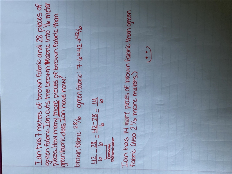 Ian has 7 meters of brown fabric and 28 pieces of green fabric. Ian cuts the brown fabric into 1-sixth-meter pieces.