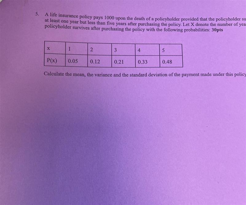 To calculate the mean, variance, and standard deviation of the payment made under this life insurance policy, we need to use the provided probabilities and the formulae for these statistical measures. Here's how you can calculate them: