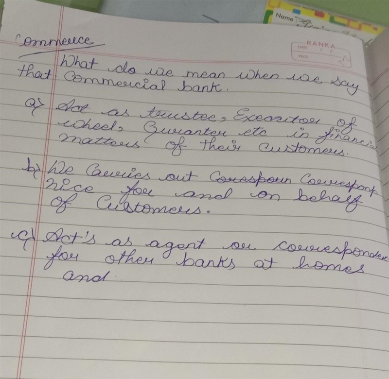 Answer: When we state that a commercial bank acts as a trustee, executor of a will, guarantor, or otherwise fulfills comparable tasks in the financial concerns of their customers, we imply that the bank takes on certain responsibilities and offers particular services to help their customers in those capacities. Let's examine each role in more detail: