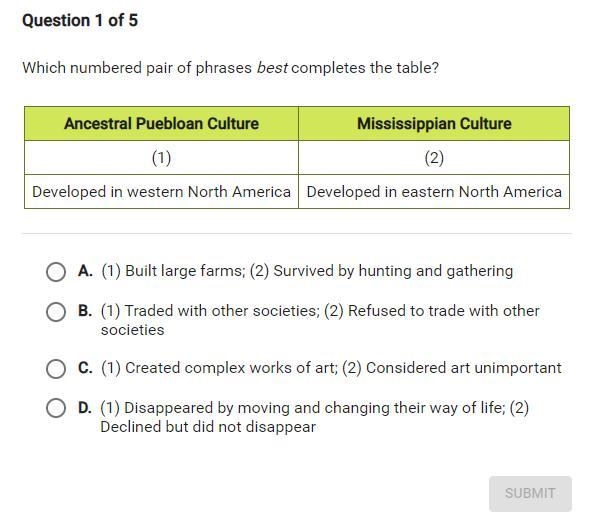 This answer is the most accurate representation of the respective cultures. The Ancestral Puebloan Culture, also known as the Anasazi, eventually disappeared by migrating and adopting different lifestyles. On the other hand, the Mississippian Culture experienced a decline but did not completely disappear.