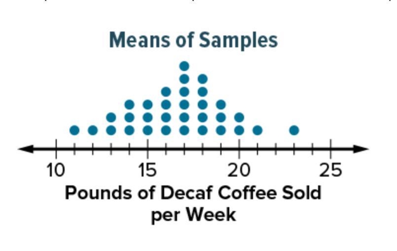 Lastly, if the company samples 200 stores and finds a mean of 17 pounds of decaf coffee sold per week, the range of values that might describe the mean for all stores in the company would be: