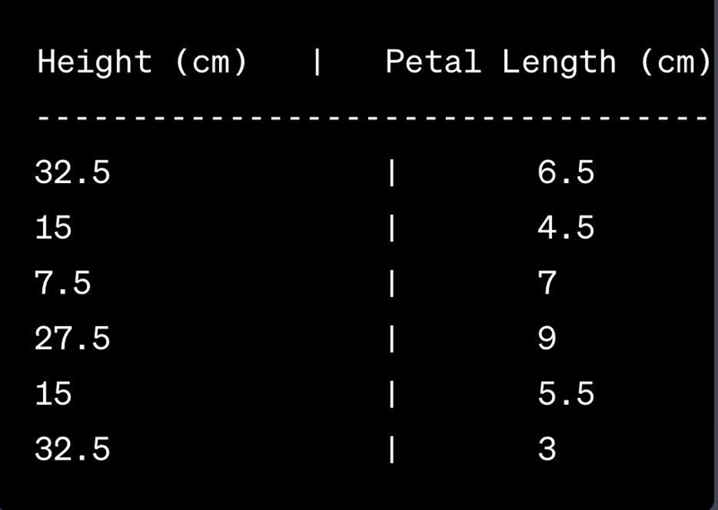 Krista measured the height and petal length (in centimeters) of all the flowers in her garden. Plot the data in a scatter plot. Height ( cm ) (cm)left parenthesis, start text, c, m, end text, right parenthesis 32.5 32.532, point, 5 15 1515 7.5 7.57, point, 5 27.5 27.527, point, 5 15 1515 32.5 32.532, point, 5 Petal length ( cm ) (cm)left parenthesis, start text, c, m, end text, right parenthesis 6.5 6.56, point, 5 4.5 4.54, point, 5 7 77 9 99 5.5 5.55, point, 5 3 3
