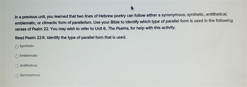 In a previous unit, you leamed that two lines of Hebrew poetry can follow either a synonymous, synthetic, antithetical, emblemstic, or climactic form of parallelism. Use your Bible to ldentify which type of parallel form is used in the following verses of Psalm 22. You may wish to refer to Unit 6, The Psalms, for help with this activity. Read Psalm 22:6. ldentify the type of parallel form that is used.