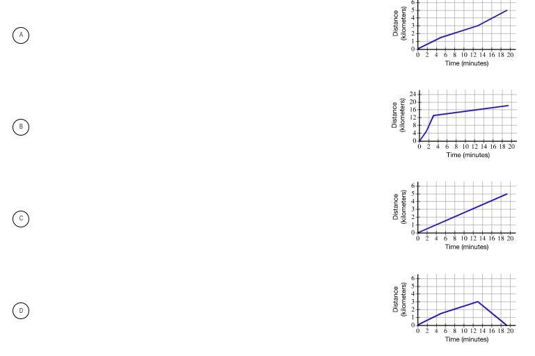 Eli finished a 5-kilometer race in 19 minutes 15 seconds to win second place. He ran the first 1.5 kilometers in 5 minutes, the second 1.5 kilometers in 8 minutes, and the last 2 kilometers in 6 minutes 15 seconds. Which of the following graphs could represent the relationship between the distance Eli ran, in kilometers, and the amount of time, in minutes, that passed since the start of the race?