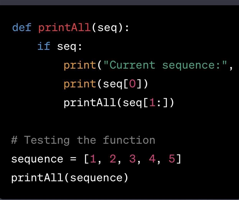 Lee has discovered what he thinks is a clever recursive strategy for printing the elements in a sequence (string, tuple, or list). He reasons that he can get at the first element in a sequence using the 0 index, and he can obtain a sequence of the rest of the elements by slicing from index 1. This strategy is realized in a function that expects just the sequence as an argument. If the sequence is not empty, the first element in the sequence is printed and then a recursive call is executed. On each recursive call, the sequence argument is sliced using the range 1:. Here is Lee’s function definition: