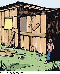 In the poignant illustration, a young boy stands forlornly beside his diminutive and dilapidated home, crafted from fragile wooden sticks. The boy appears to be around 8 or 9 years old, as evidenced by his small stature and dejected expression.