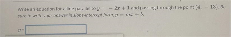To find the equation of a line parallel to the line y = -2x + 1 and passing through the point (4, 13), we need to determine the slope (m) of the new line.