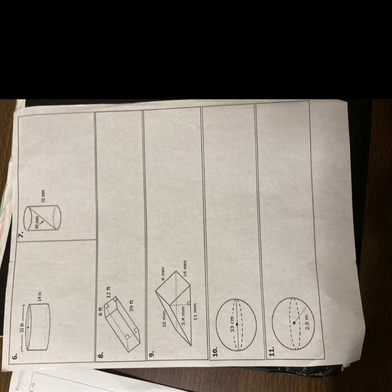 Volume of cylinder (questions 6 and 7 are cylinders) = π r ² h