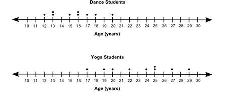 The dot plots below show the age of some dance students and some yoga students: