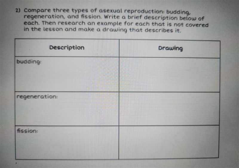 Here are descriptions of the three types of asexual reproduction along with examples: