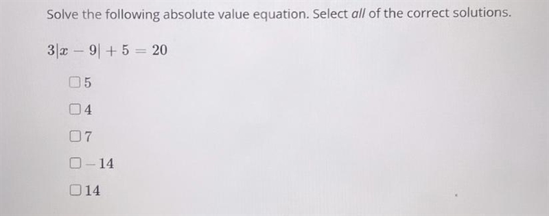 3 |x - 9| + 5 = 20 >Subtract 5 from both sides