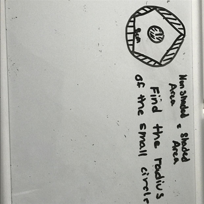 The area of the unshaded area is the area of the regular pentagon less the area of the small central circle.