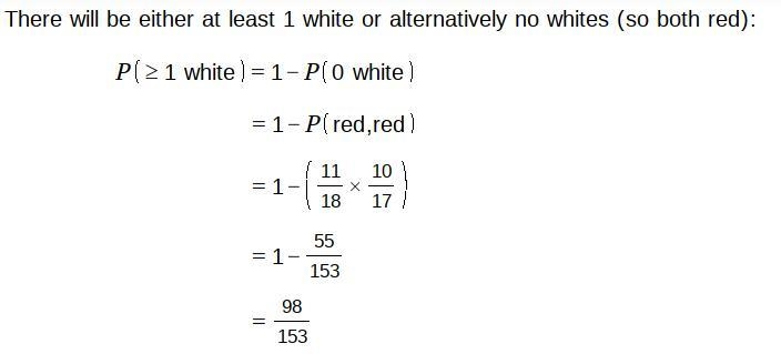 a gumball machine contains 11 red gumballs and 7 white gumballs. two gumballs are purchased, one after the other, without replacement. find the probability that at least one gumball is white.
