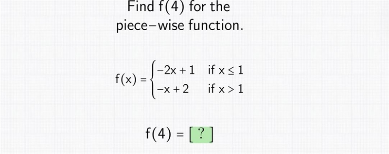 FOUR is GREATER than 1 so you use the bottom portion of the function definition : -x +2 when x is equal to 4 this is equal to -2