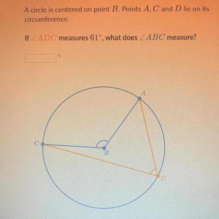 ∠ADC and ∠ABC subtend the same arc AC, hence ∠ABC is double the measure of ∠ADC: