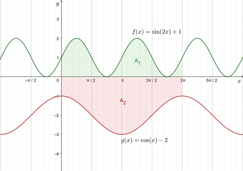 ![\begin{aligned}A_2=-\displaystyle \int^(2\pi)_(0) (\cos(x)-2)\; \text{d}x&=-\left[\vphantom{\frac12}\sin(x)-2x \right]^(2\pi)_(0)\\\\&=-\left[(\sin(2\pi)-2(2\pi))-(\sin(0)-2(0))\right]\\\\&=-\left[(0-4\pi)-(0-0)\right]\\\\&=-\left[-4\pi\right]\\\\&=4\pi\end{aligned}](https://img.qammunity.org/2024/formulas/mathematics/college/je7eodq3056z5xsfaf09ptknf4cni643ad.png)