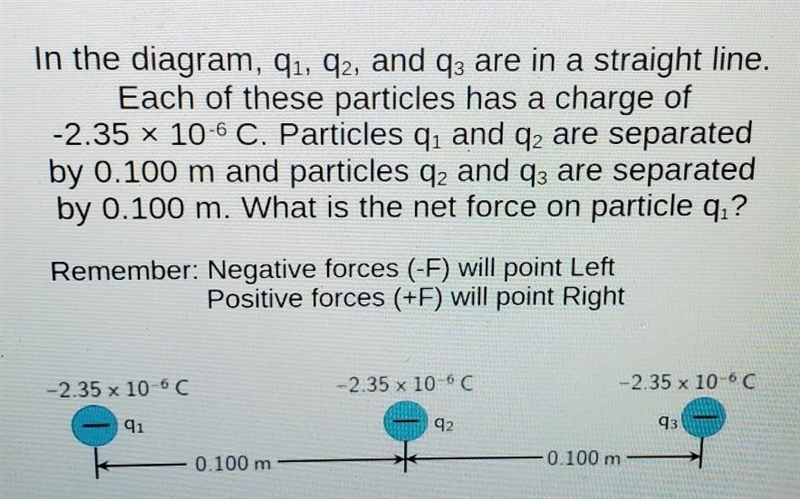The direction of this force will be towards q₂, since the force between q₁ and q₂ is attractive. Therefore, the correct answer to the question is that the net force on particle q₁ is -1.11 x 10⁻³ N.