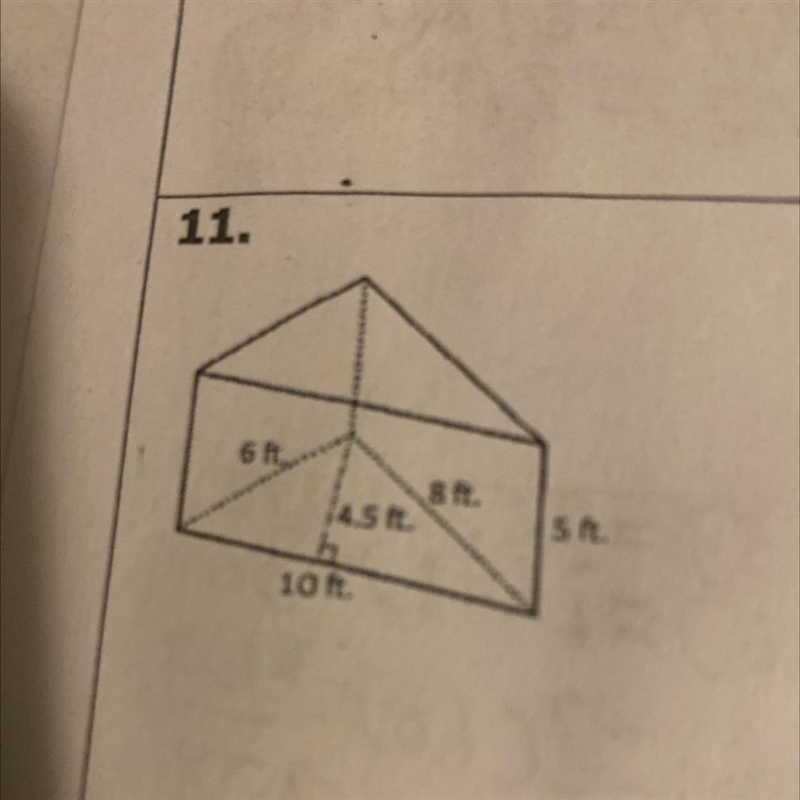 1. First find the area of the bottom face (you don’t need to divide by two because the other triangle makes the one on the bottom a full rectangle.)
