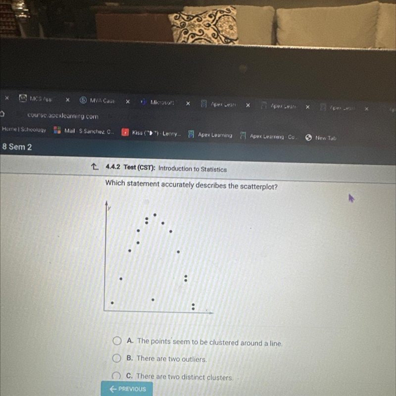 Which statement accurately describes the scatterplot? A. The points seem to be clustered around a line. B. There are two outliers. C. There are two distinct clusters B. There is…