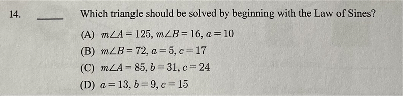 The Law of Sines can be used to solve triangles when you have two angles and a side (AAS or ASA) or two sides and a non-included angle (SSA). In this case, triangle A can be solved using the Law of Sines because it has two angles and a side (AAS).