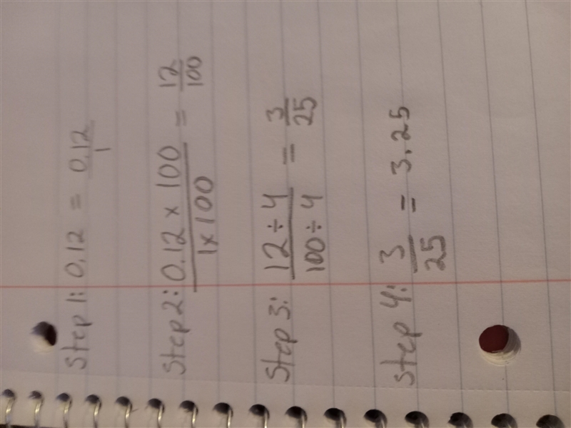 Step 1) Convert the decimal number to a fraction by making 0.12 the numerator and 1 the denominator