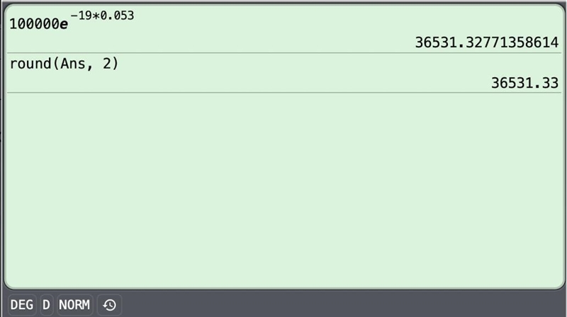 P = 100,000·e^(-0.053·19) ≈ 36,531.33