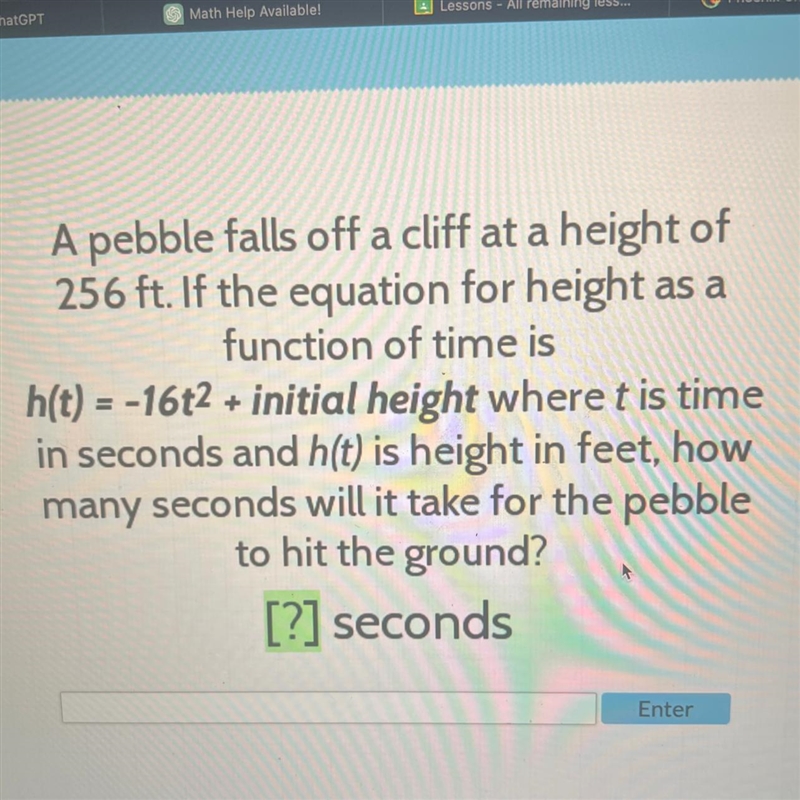 h(t)=-16t^2+256\\0=-16t^2+256\\16t^2=256\\t^2=16\\t=4
