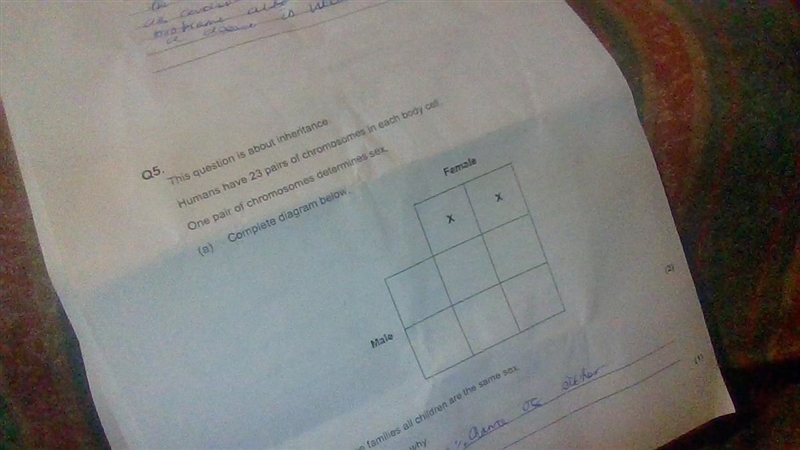 This question is about inheritance. Humans have 23 pairs of chromosomes in each body cell. One pair of the chromosomes determine sex. (a) complete diagram below