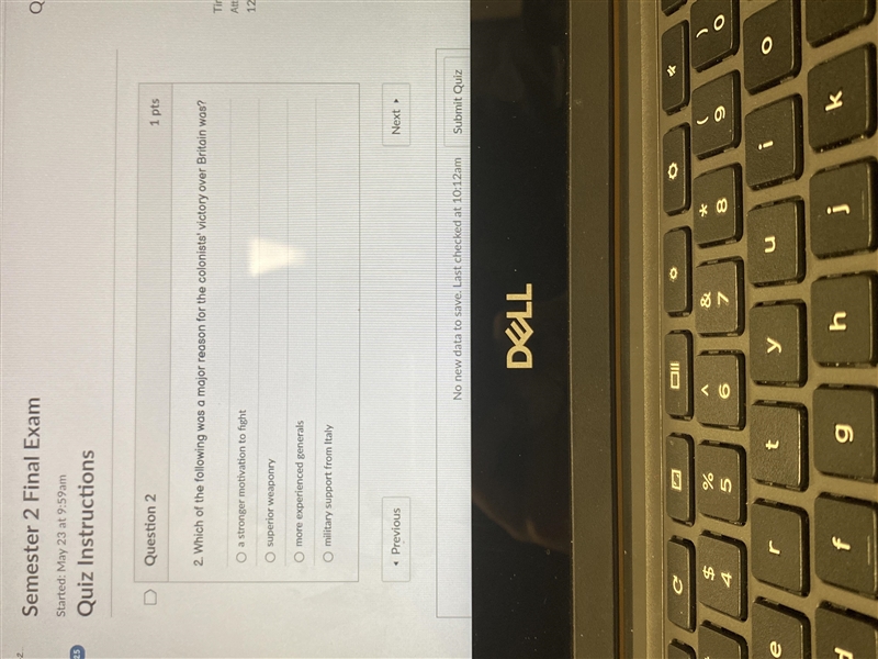 Option B, superior weaponry, is not a major reason for the colonists' victory. The British army actually possessed more advanced and superior weaponry compared to the colonial forces.