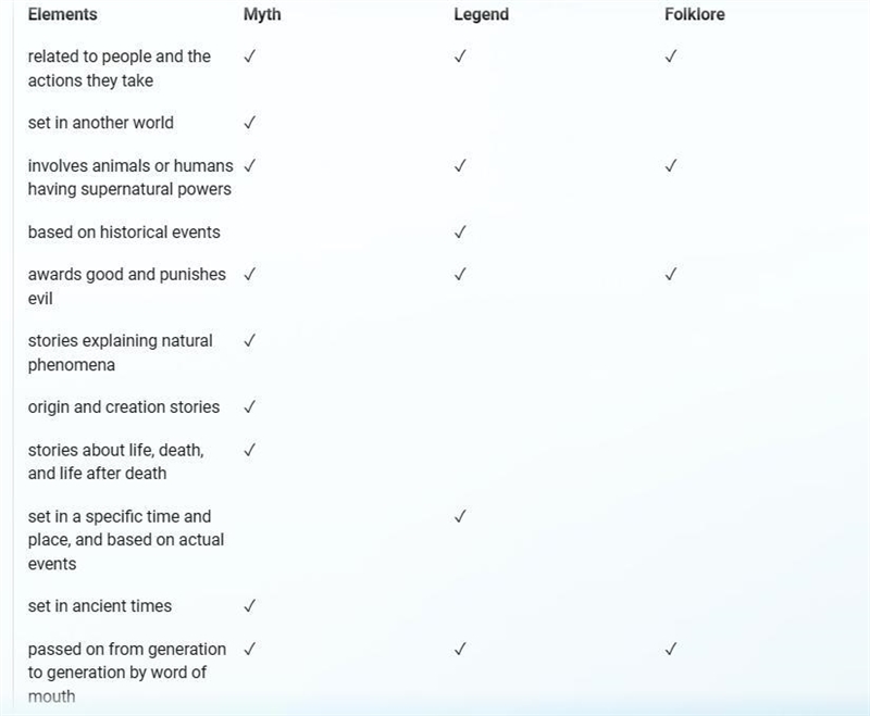 There is a very thin line between myths, legends, and folklore. All of these stories include certain elements that help determine the difference between them. The table below contains a list of elements that are related to these three genres. Tick the box for each element to identify if it applies to myth, legend, or folklore. Each element could apply to more than one genre.