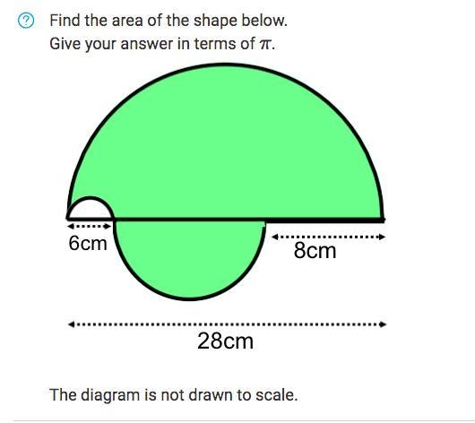 Find the area of the shape below. Give your answer in terms of π . The diagram is not drawn to scale.