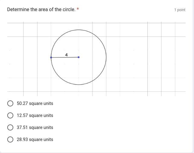 picture #1 - area = πr^2 -> π*4^2 = 50.27 square units