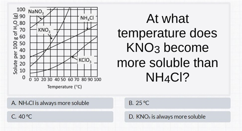 PLEASE HELP ME 35 POINTS :) RIGHT ANSWERS ONLY At what temperature does kno3 become more soluble than nh4ci