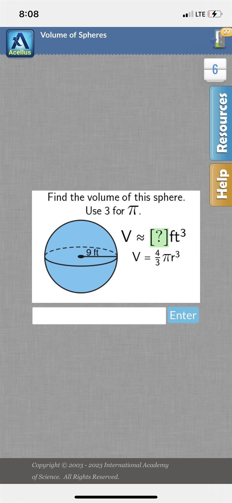 Find the volume of this sphere use three