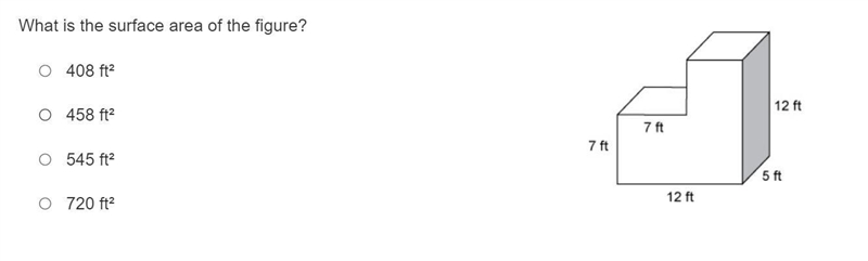 The figure has a surface area of 458 square feet. This can be calculated by adding the areas of all the surfaces or boundaries of the figure. In this case, we have a figure with dimensions of 12 by 5, another side with dimensions 12 by 5, a side with dimensions 7 by 7, and finally a side with dimensions 5 by 12. By multiplying the length and width of each side, and then adding them all together, we get a total surface area of 458 square feet. Therefore, the correct option is B.