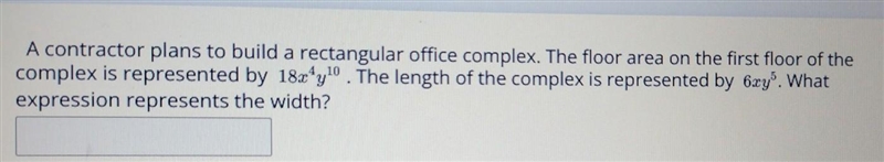 A contractor plans to build a rectangular office complex. The floor area on the first floor of the complex is represented by 18x4y10. The length of the complex is represented by 6xy³. What expression represents the width?