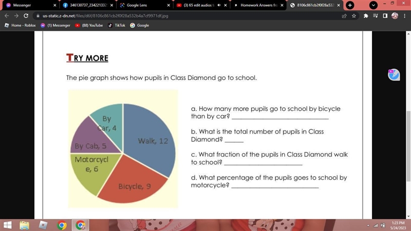 b. The is answer is 36 because 12 people walked, 9 people biked, 4 people walked, 6 people used a motorcycle and 5 people used a cab and 12+9+4+6+5=36