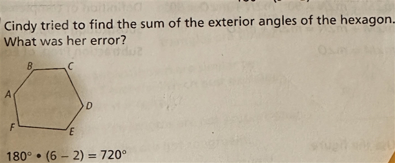 What Cindy did was found the total interior angle measure of a hexagon which is 720