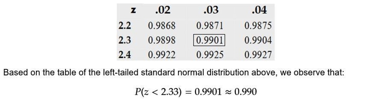 Find the proportion of observations in a standard Normal distribution that satisfies the following statement. z<2. 33 0. 010 0. 101 0. 880 0. 950 0. 990