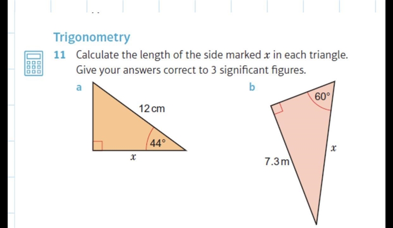Calculate the length of the side marked X in each triangle. Give answer to 3 significant figures.