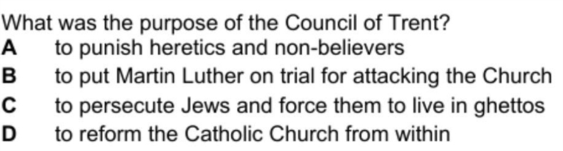 Answer is D, it was the Catholic Church’s response to the Protestant reformation.